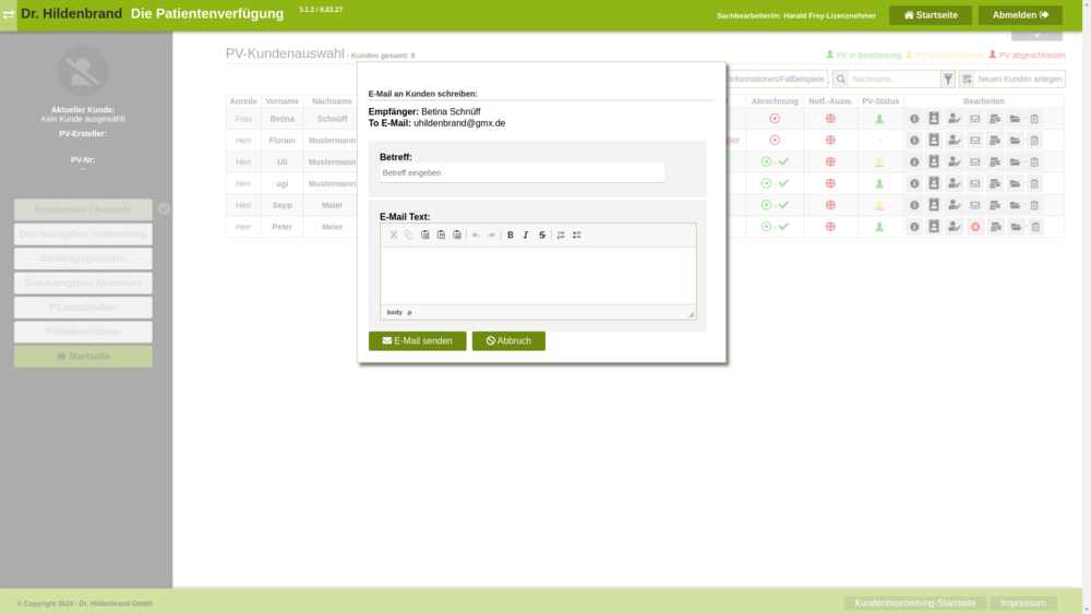 Für jeden Kunden gibt es eine informative Kurzübersicht über die Kundendaten und den Status der Patientenverfügung, sowie die Möglichkeit dem Kunden direkt eine E-Mail zu schreiben.